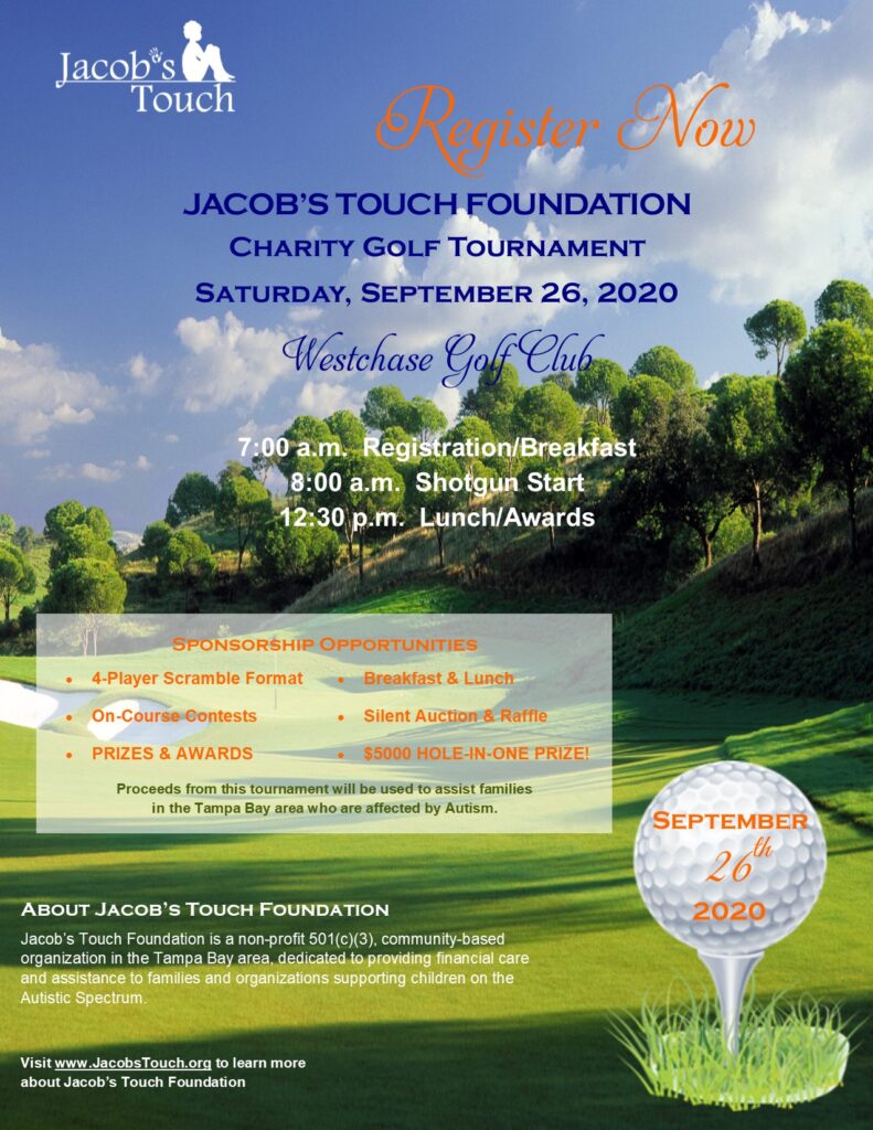 Jacob’s Touch Foundation will host our annual charity golf tournament on Saturday, September 26, 2020 at the beautiful Westchase Golf Course. All proceeds from this event will help us further our mission to provide financial care and assistance through grants for therapy, medical and educational needs to families and organizations supporting children on the Autistic Spectrum.